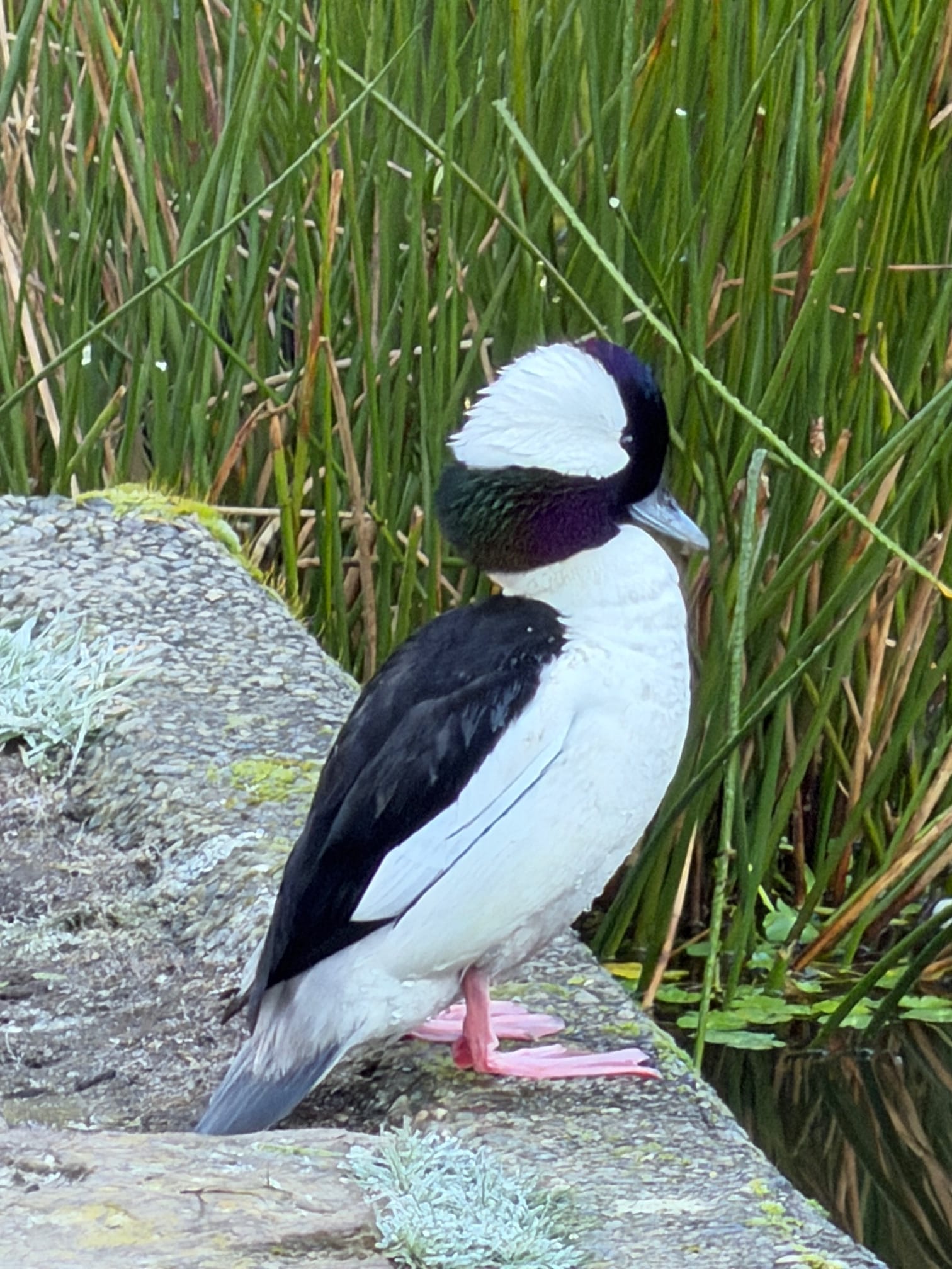 Who doesn’t like a Bufflehead? These little ducks bob up and down in the pond and try to stay out of everyone’s way. The males have lovely iridescent green/blue head feathers topped by a sparkling white cap. Jim Dubeck, one of We Happy Few, sent in this photo. Looking at it, I realized that I couldn’t remember ever seeing a buffle on foot! Buffles forage underwater, looking for insects in fresh water or crustaceans in salt water. They don’t join the other ducks who hop up onto the shore looking to chow down on grass, insects, or bread crumbs.