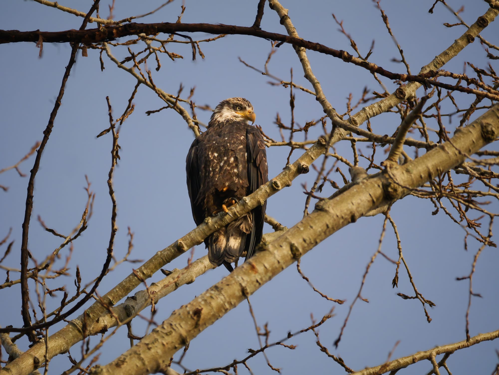 Bald Eagles don’t get their white heads until their fourth or fifth year. This adolescent is waiting for its complexion to clear up. You remember what that was like. It can’t happen quickly enough.