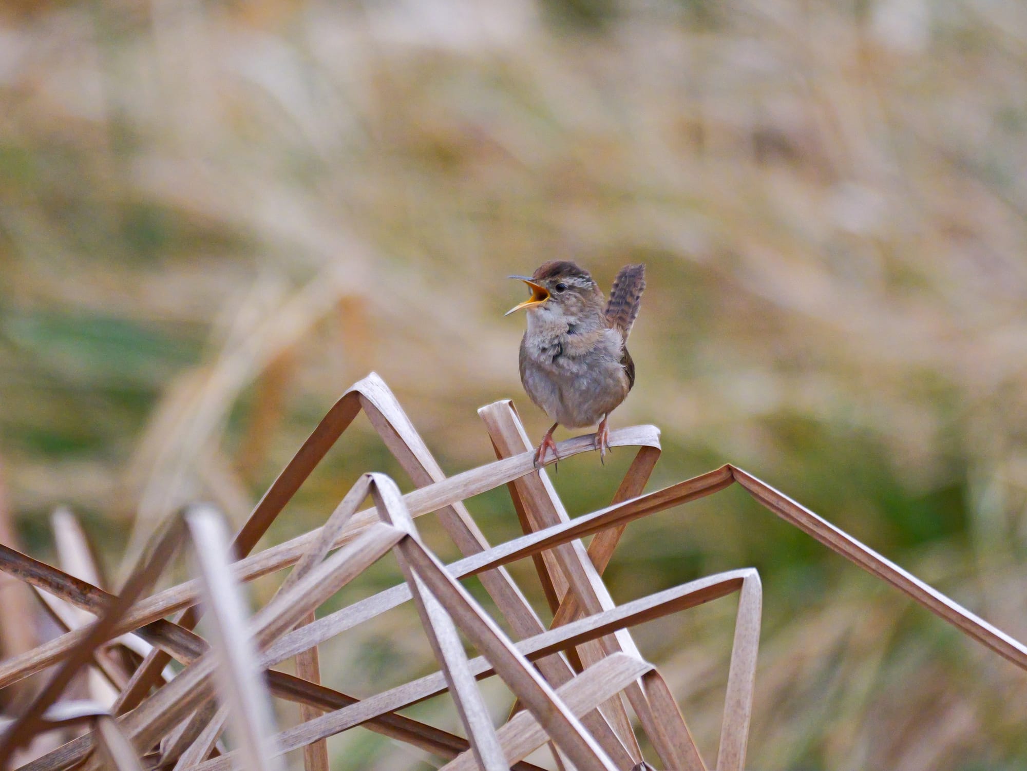 I love spunky little Marsh Wrens. They prefer the safety of hiding down in the cattails, but it’s that time of year and they’re not going to meet That Special Someone down in the basement. So they take the risk, come up top, and sing their love call. It might sound like robotic clicks to us, but to a wren it’s Puccini.